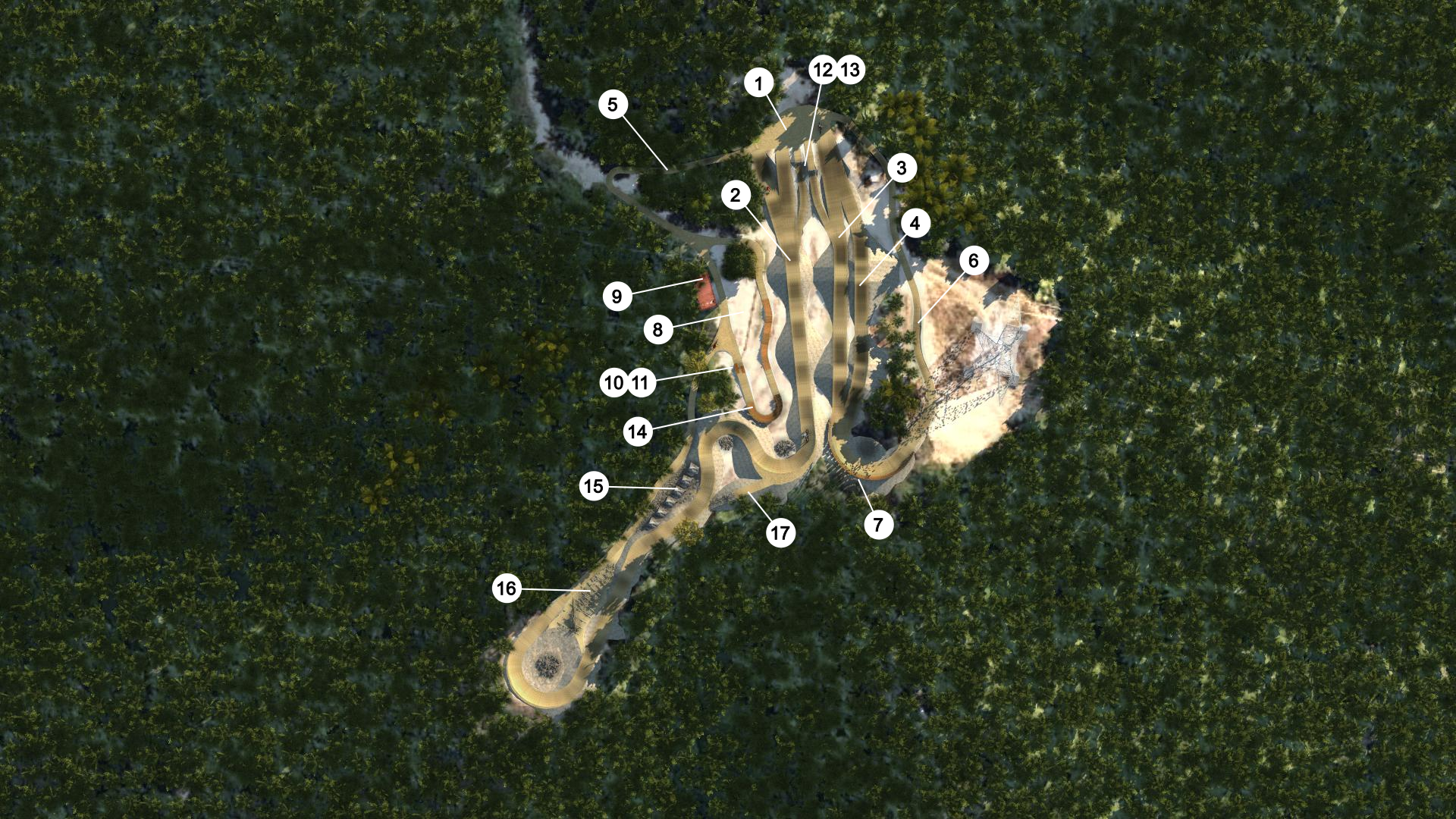 The final layout for the Mākara Peak Skills Park balances progression, safety, and rider enjoyment while making the most of the available space within site constraints. Features are strategically grouped to support skill development from beginner to expert levels, with clearly defined trail zones, dedicated return paths, and an open area for free practice.