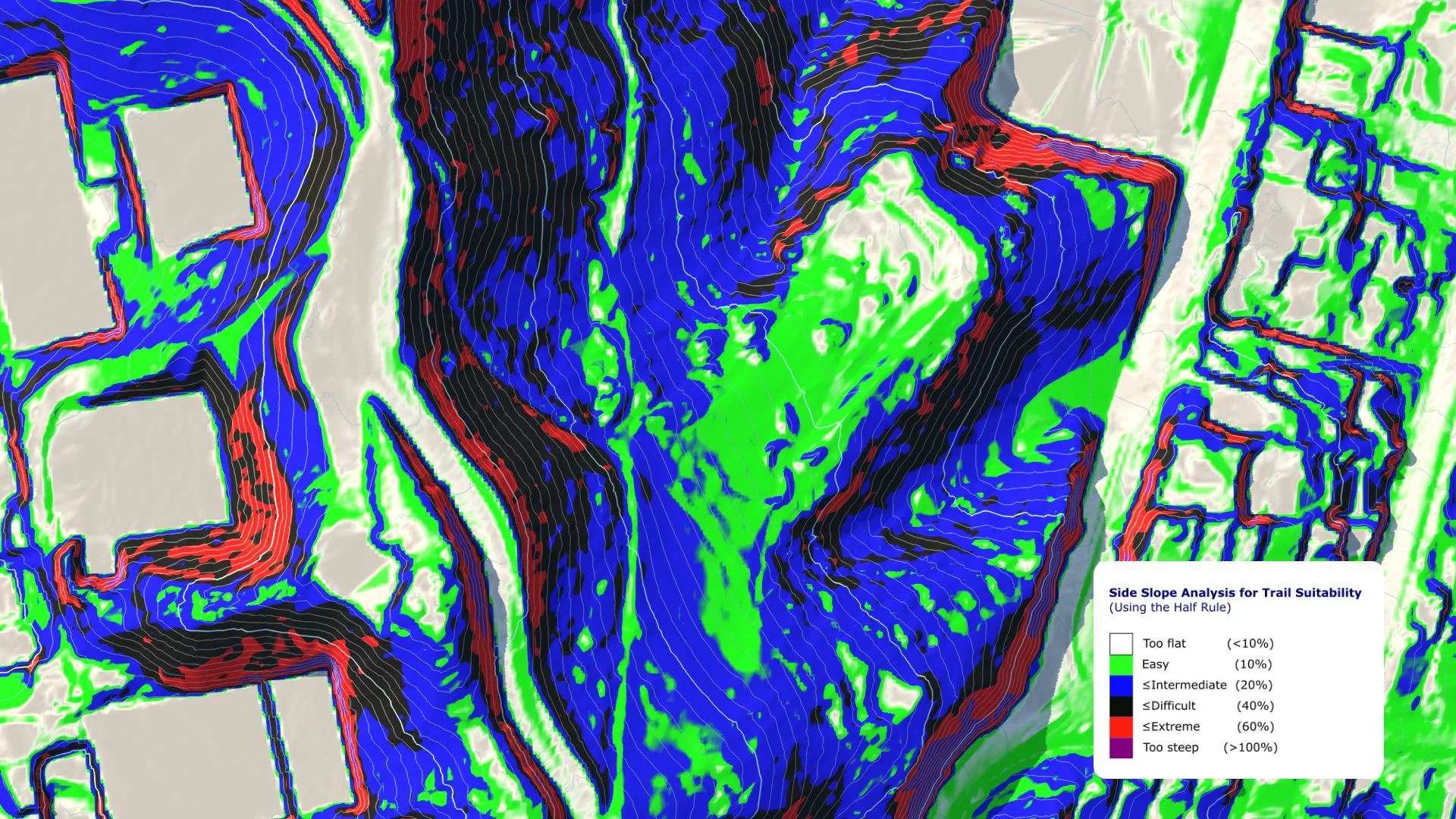 Uses colour coding to indicate suitability for trail placement based on the “half rule” of sustainable trail design, which recommends that a trail’s gradient not exceed half of the side slope’s grade. Areas under 10% slope are generally avoided due to poor drainage, areas exceeding 40% become progressively more expensive to construct due to rocky terrain, and above 60% can become geotechnically unstable.